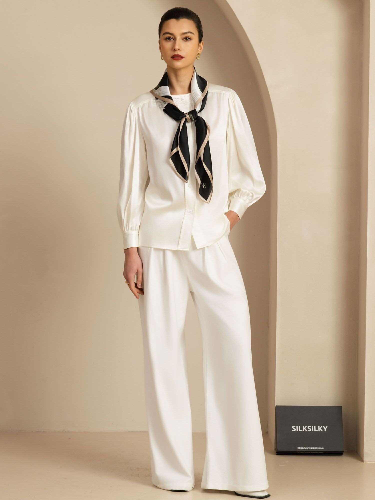 مصنوع من حرير طبيعي 100%، يتميز هذا الوشاح بملمس ناعم كالحرير ولمعان فاخر. تأتي قاعدته السوداء مزينة بأناقة بنقوش شرائط بيضاء رقيقة تضيف لمسة راقية إلى أي إطلالة. مثالي للإطلالات اليومية أو العمل أو المناسبات المسائية. يمكن تنسيقه حول الرقبة أو ربطه على الحقيبة أو ارتداؤه كغطاء للرأس. صُنع بواسطة SilkSilky المعروفة بالحرير الفاخر والحرفية المتميزة، مما يضمن جودة تدوم وأناقة خالدة.