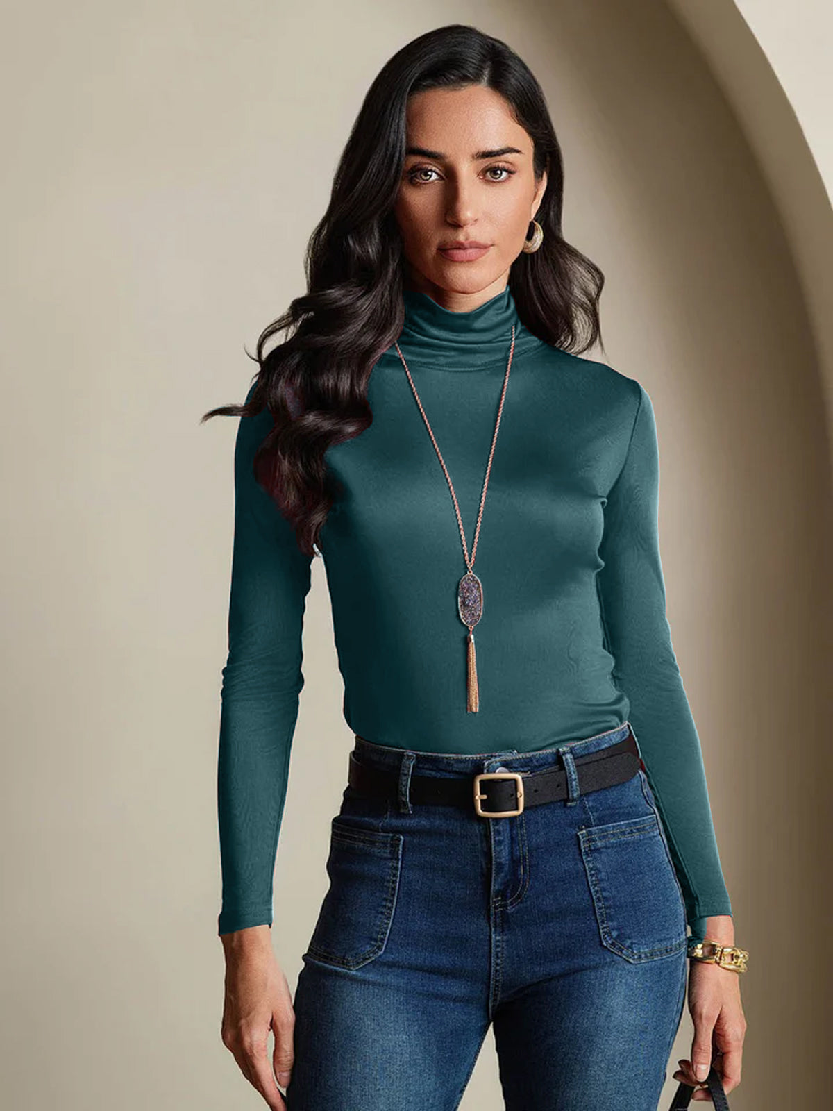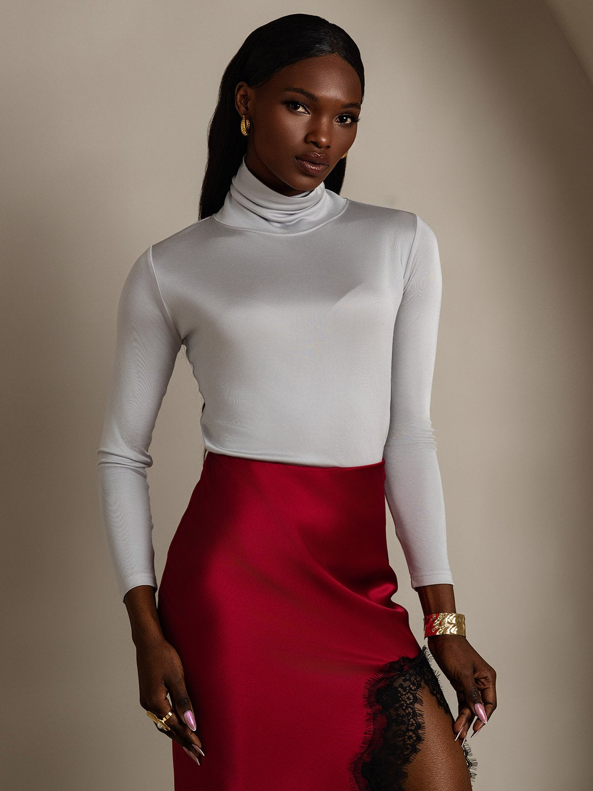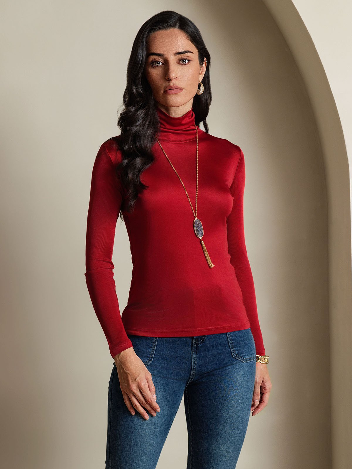 مزيج الحرير تي شيرت بأكمام طويلة وياقة مرتفعة